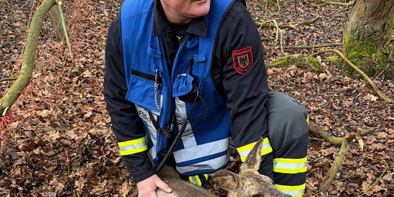 Vor Ort stellten die Feuerwehrleute fest, dass sich ein sehr junges Reh mit dem Kopf im Zaun verfangen hatte und nicht mehr in der Lage war, seinen Kopf aus dem Zaun heraus zu ziehen. Die Kollegen nahmen das Tier behutsam auf den Arm und schnitten die Maschen um den Kopf des Rehes auf, um das Tier schonend zu befreien.